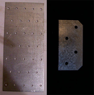- Metal Plates - click here to see a picture. There are a few options with this part of the project. I'm simply going to instruct you on the easiest way that requires the least amount of special tools or effort. You'll need 4 of the larger plates (approx 3" x 7") and 4 small plates (1" x 3"). You can find these near the lumbar with the rest of the decking/framing braces. I also show you a fancy upgraded version, for which you'll need 10 of the large plates. Scroll way down to see and decide which you like better.